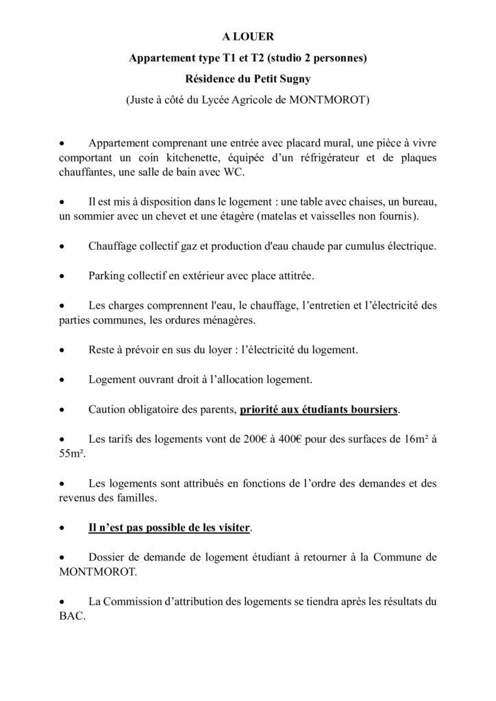 A LOUER APPARTEMENTS POUR ETUDIANTS LYCEE AGRICOLE
