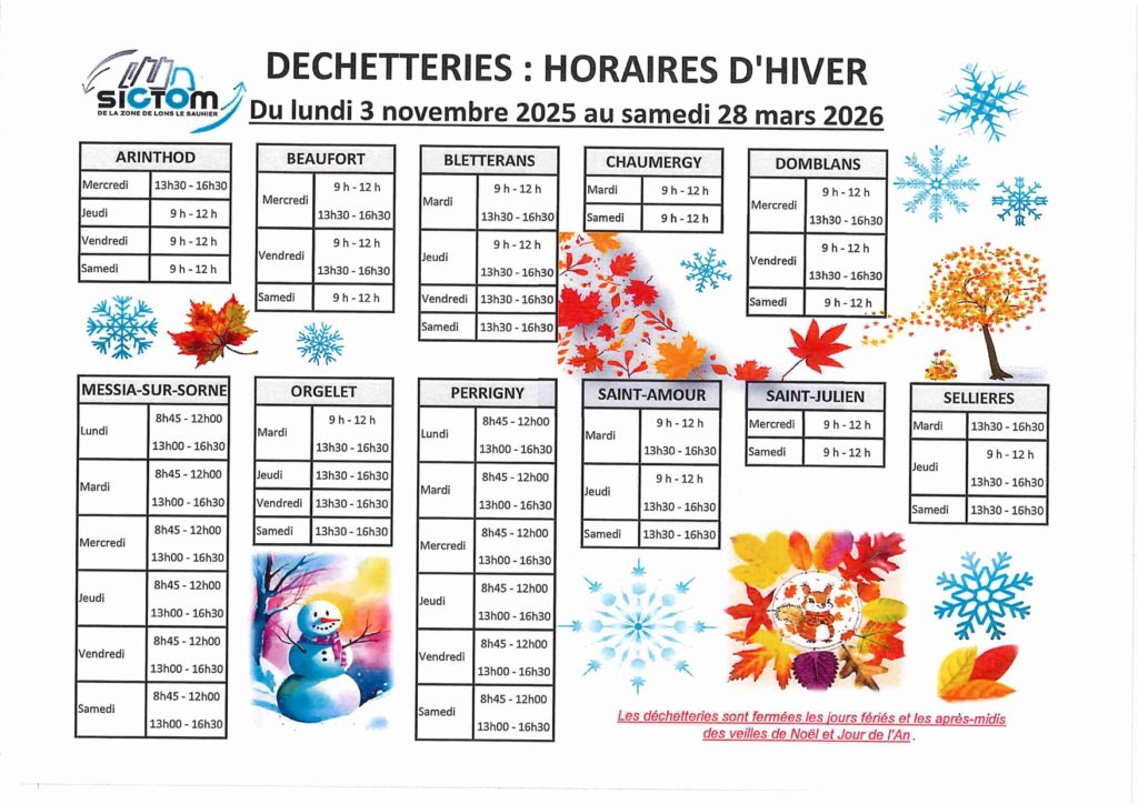 HORAIRES D’HIVER DECHETTERIES DU 3/11/2025 AU 28/03/2026